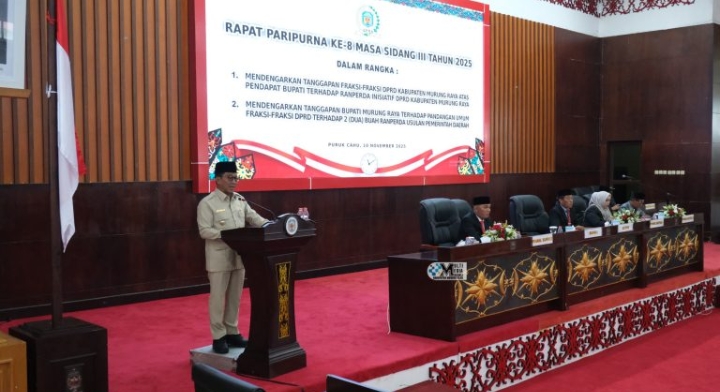 PURUK CAHU, ajun.or.id – Bupati Murung Raya (Mura) Heriyus menyampaikan tanggapan atas pemandangan umum Fraksi-Fraksi DPRD Kabupaten Murung Raya terhadap dua Rancangan Peraturan Daerah (Raperda) usulan Pemerintah Daerah, dalam Rapat Paripurna DPRD ke-8 Masa Sidang III, yang digelar di Ruang Rapat Paripurna DPRD Murung Raya, Senin (10/11/2025).