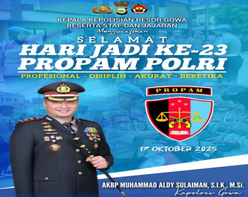 POLRES GOWA | AJUN.OR.ID–Kepala Kepolisian Resor Gowa AKBP Muhammad Aldy Sulaiman, S.I.K., M.Si. beserta seluruh staf dan jajaran menyampaikan ucapan selamat Hari Jadi ke-23 Propam Polri, yang diperingati setiap tanggal 17 Oktober, Jum’at (17/10/2025).