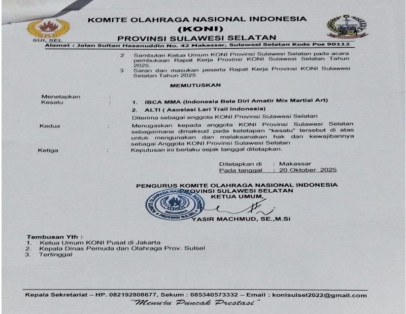 Makassar  | AJUN.OR.ID— Komite Olahraga Nasional Indonesia (KONI) Provinsi Sulawesi Selatan memberikan apresiasi kepada Indonesian Mixed Martial Arts (IBCA MMA) Sulawesi Selatan dalam acara Rapat Kerja Provinsi (Rakerprov) dan Rapat Pleno Pengurus KONI Sulsel Tahun 2025.