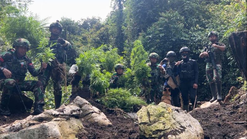 Oksibil | AJUN.OR.ID– Pegunungan Bintang — Patroli Keamanan oleh Satgas Yonif 751/VJS dan Satgas Intel lainnya dipimpin langsung oleh Dansatgas Yonif 751/VJS Letkol Inf Erwan Harliantoro ke arah Hutan Dusun Ngutok, Kampung Kabiding, Distrik Oksibil kembali menghasilkan penemuan ladang ganja dengan jumlah Pohon yang tertanam sekitar 740 batang.(Selasa,21/10/2025)